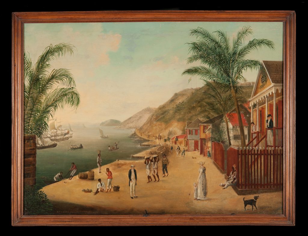Bild över Gustavias hamn. På bilden syns bland annat en svensk flagga och slavar med kedjor. Bild: Sjöhistoriska museet