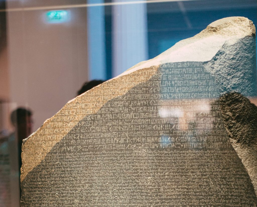 Rosetta-stenen på ett museum i London. Stenen kommer från Egypten och de vill få tillbaka den. Foto: Matteo Vistocco/Unsplash (beskuren).