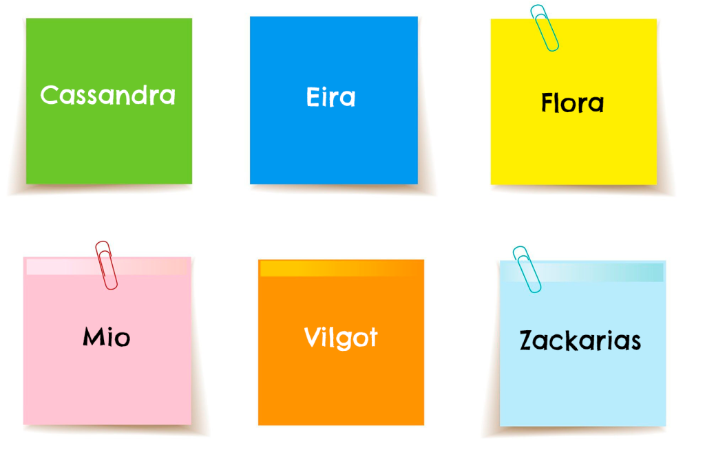 Namnen är: Cassandra, Eira, Flora, Mio, Vilgot och Zackarias.